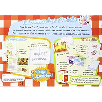 Ce coffret permet aux enfants de 7 ans et plus d'inviter leurs parents au restaurant ! Laissez-vous donc chouchouter par vos bien-aimés bambins qui auront pris soin de respecter l'étiquette à la lettre et de vous concocter leurs meilleures spécialités en cuisine. Le coffret offre l'opportunité de créer 4 restaurants : brasserie française, restaurant chinois, trattoria italienne et snack américain.Grâce au Petit guide de salle du Parfait serveur, il vous aura remis vos invitations, dressé la table avec les sets personnalisables et le juste emplacement des verres et des couverts, vous aura placé grâce à vos porte-noms, et aura même identifié les différents espaces grâce à la plaque «Réservé au personnel» ! Grâce au Manuel du petit cuistot, vos papilles seront tout éveillées : vous préférerez peut-être le Melon et sa chiffonnade de jambon cru suivi des pâtes à la carbonara et sa panna cotta aux fruits rouges, bien notés dans son précieux carnet de commandes ; ou encore une Caesar Salade avec un Hamburger maison & chips et s il vous reste encore un peu de place, un Hot Fudge Sundae pour une soirée spéciale Superball ? En plein Tour de France, en revanche, vous pourrez sûrement opter pour une charmante brasserie parisienne avec en entrée, un pâté de campagne aux cornichons, une omelette au jambon et au fromage accompagné de sa salade verte en plat et une île flottante en dessert pour Monsieur, une mousse au chocolat pour Madame... à moins que ce ne soit l'inverse ?En plus, votre enfant sera méconnaissable avec sa Toque de grand chef, ce qui vous enthousiasmera sans effort au moment de l'addition, que vous pourrez régler avec les petits billets qu'il aura discrètement glissés dans votre poche, la carte bleue ou même les tickets... restaurant, évidemment !Bref, un coffret d'activité pour les enfants qui fait le bonheur des parents !